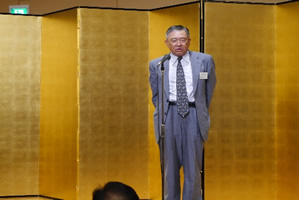 続いて、役員・総代、それ以外の組合員やメーカー会員ら約160名が参加する懇親会に移り、古里副理事長が組合の前年度事業を報告し、「組合の質を上げなければ、その存在意義はない」と述べ、今、組合改革を進めている点を強調しました。