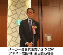 その後、メーカー会員を代表してアネスト岩田㈱の壷田貴弘社長があいさつと乾杯の発声を行いました。壷田社長はそのあいさつの中で、中国市場における自社製品に出回った自社製品のデッドコピー品の排除活動の顛末を披露し、その話題の締めくくりに「厳しい時代だが、我々は頑張るしかない」との決意を示して、乾杯の発声を行い、杯を高く挙げました。